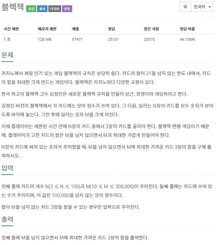 카드의 합이 M값에 가까운 것을 비교해서 리턴해주는 것으로 해결하였다