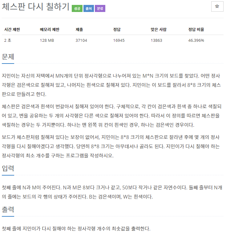 체스판이 2가지 타입인 것을 모르고 보드 입력 값의 첫 번째 값을 체스판으로 만들어서 제출을 했는데 계속 실패를 해서 질문 게시판을 보다가 테스트 케이스를 보고 깨달았다