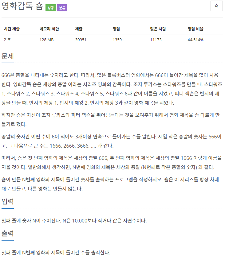 처음 문제를 보곤 N - 1 에다가 666 글자만 붙이면 되는 거 아닌가?라는 생각을 하고 코드 제출했을 때 실패를 해서 왜 실패를 하지?라는 생각에 시간을 많이 소비했다