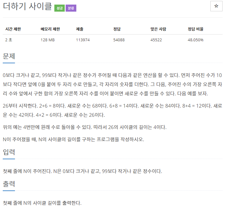 새로운 수 = (주어진 수를 10으로 나눈 나머지 값에서 * 10) + (각 자릿수 더한 값을 10으로 나눈 나머지 값)