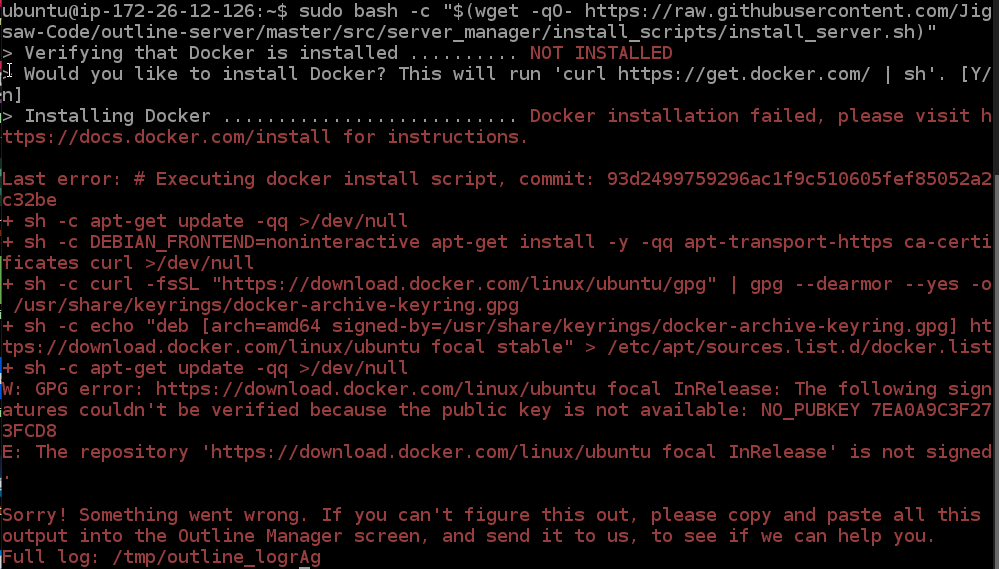 docker 설치 완료 후 outline 설치 커맨드를 실행하면 정상적으로 설치가 됩니다